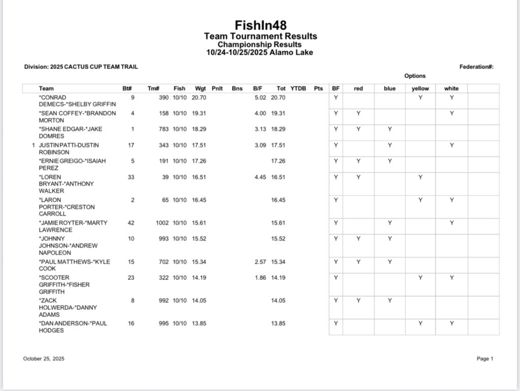 - The highest weight will be declared 1st place and receive points equal to the total number of teams that fished the given event.