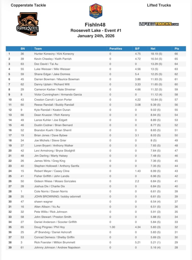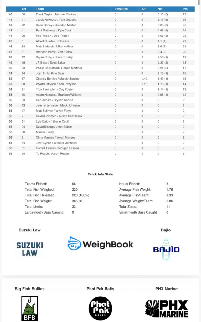- The highest weight will be declared 1st place and receive points equal to the total number of teams that fished the given event.